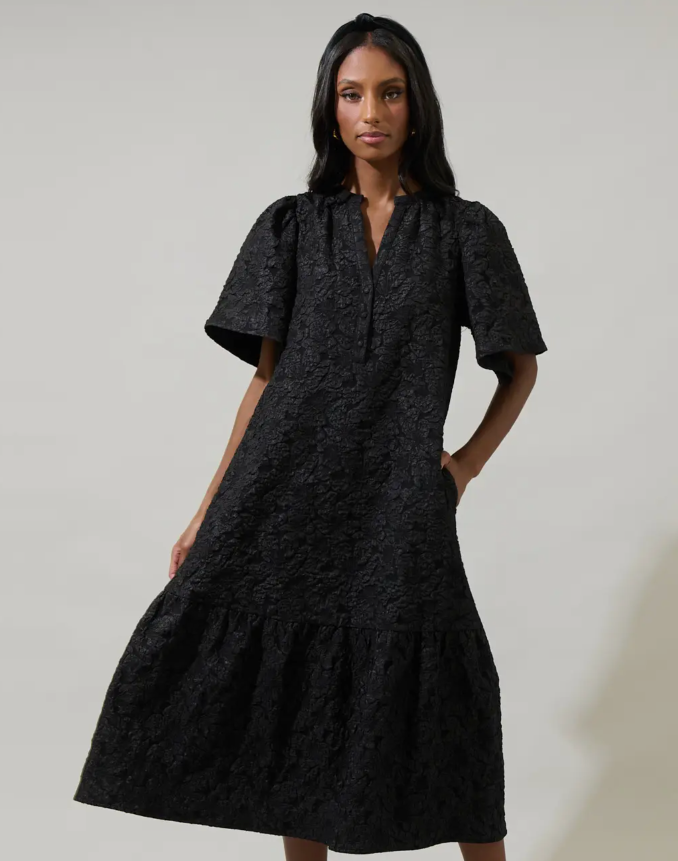 Show off your heavenly style in the Arielle Jacquard Floral Ely Midi Dress. A jacquard floral designs this midi dress with flutter shorts sleeves and henley split neckline. It has a loose fit that is east to pair with any heels, gold accessories and a clutch bag for a look that everyone will be obsessed with.