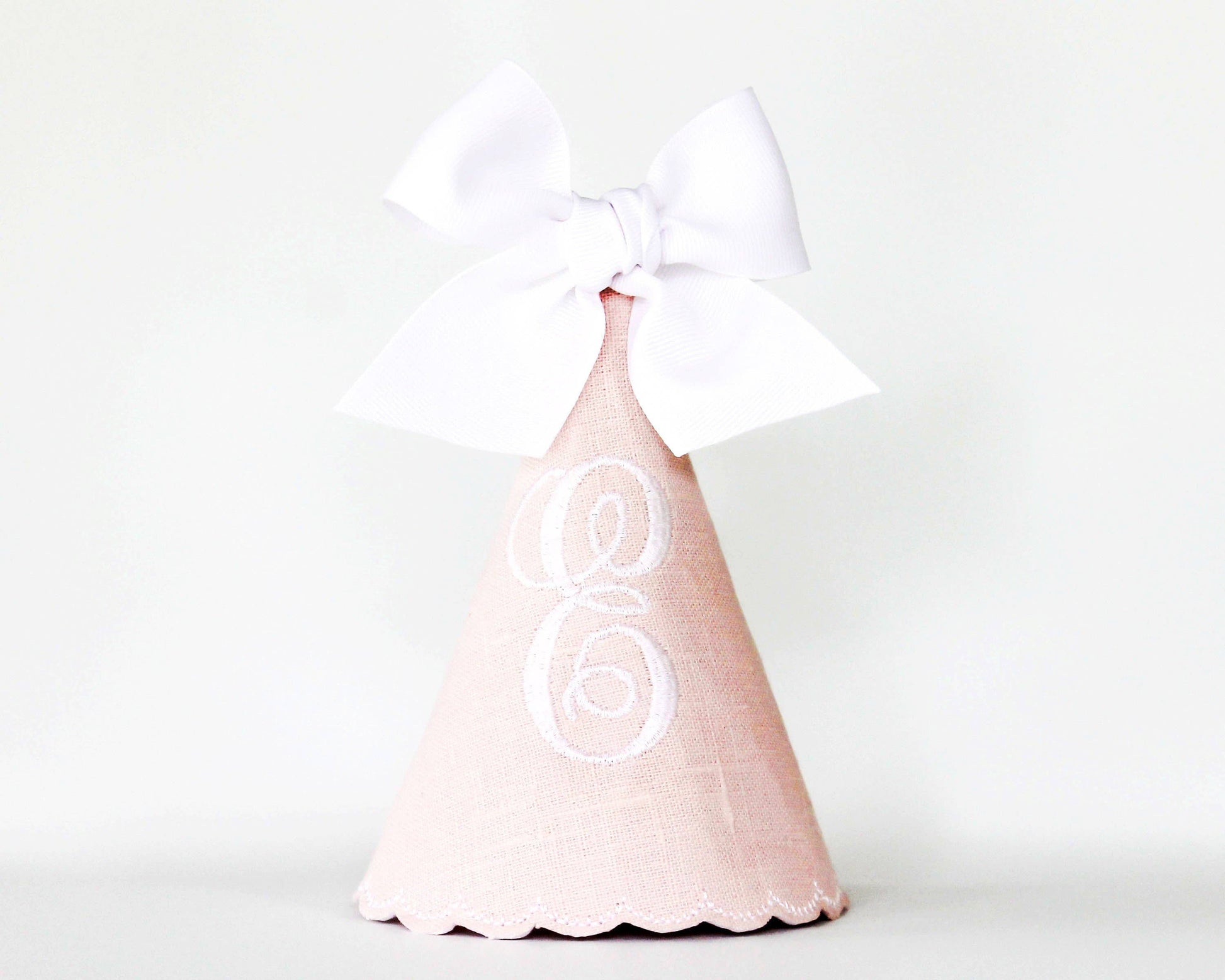 100% linen. Blush linen with white embroidery. Fully sewn to ensure that it lasts for many birthdays. Choose from an elastic band or ribbon ties. Available with bow or pom pom topper.