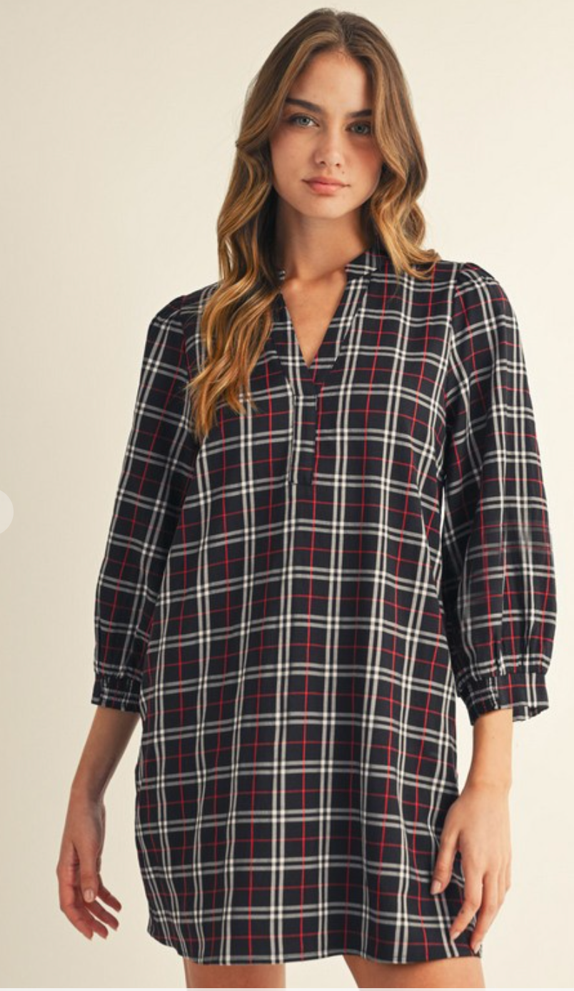 3/4 puff sleeves checker dress, v neckline, side pockets.