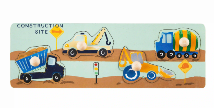Little learners will love our Construction site knob puzzle. The wood puzzle features knob handles. The puzzle features shapes of various parts of a construction site with fun accompanying graphics. The puzzles are great for toddlers and we recommend the puzzle for children ages 18 months or older.