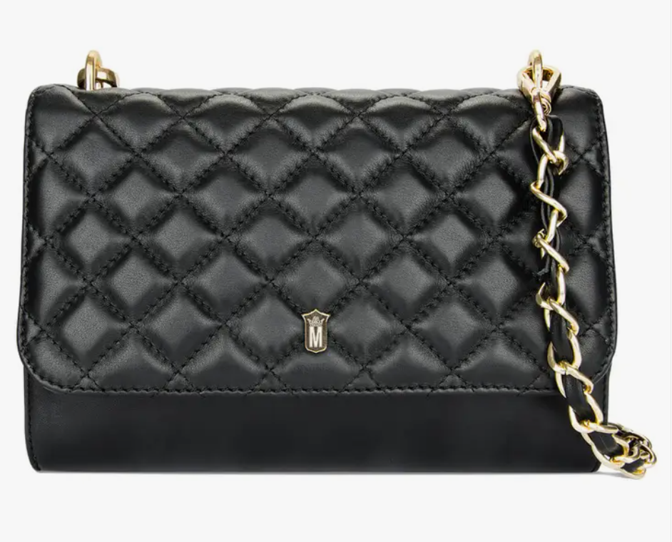 The quilted Marina Evening Bag is a chic and timeless piece for any stylish wardrobe. The soft first-cut leather, with padded cushion flap, is embellished with the Marina Range crest. * Raven Black * Made from first grade leather * Includes two detachable shoulder straps – one chain and one leather * Internal zip pocket * Fully lined * Comes with dust bag * 22.5cm (w) x 16cm (h) x 6.5cm (d) * Designed and created in Covent Garden, London