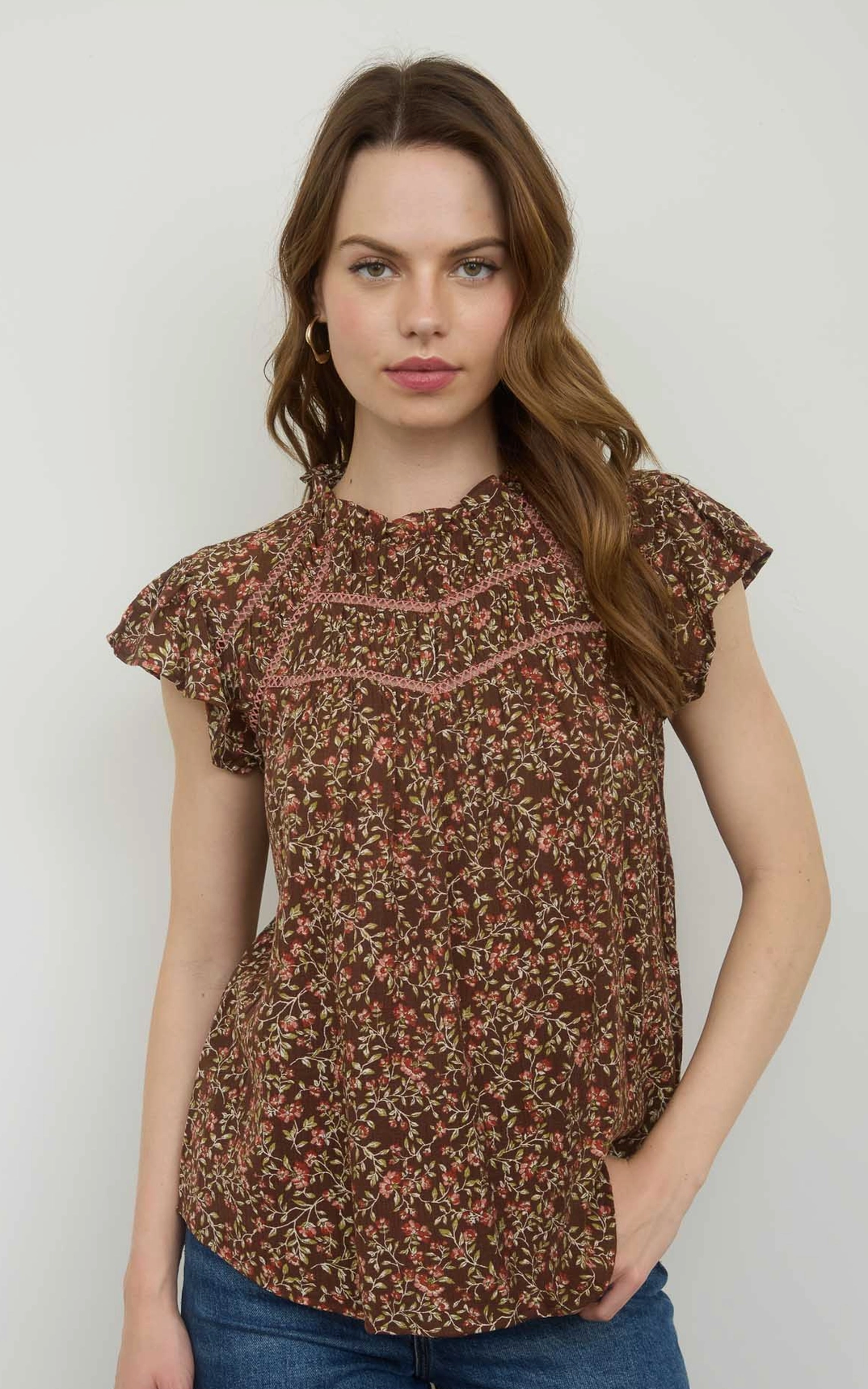 Floral Lace Yoke Trim Ruffle Detail Short Sleeve Top