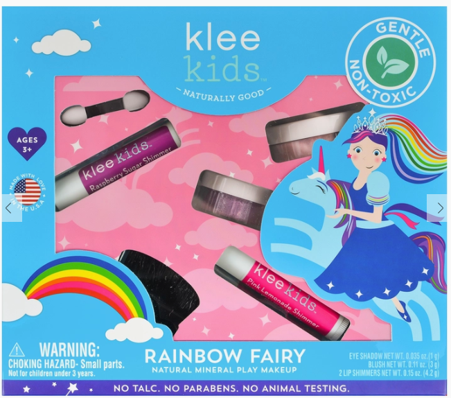 Pretend play can now be worry-free with Klee Kids Natural Mineral Makeup, formulated with NO talc, NO parabens, NO synthetic dyes and NO synthetic fragrances. No animal testing and gluten free. Sparkle Fairy includes the Rainbow Dazzle loose-powder eyeshadow, Sunshine Sparkles blush and Pink Lemonade organic lip shimmer and Raspberry Sugar lip shimmer. Made in USA.