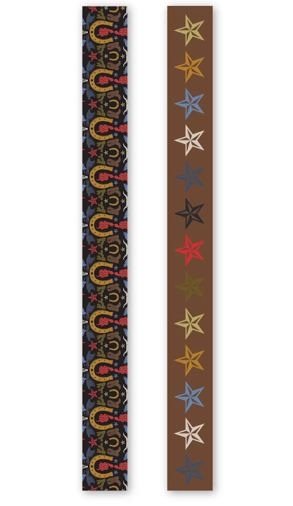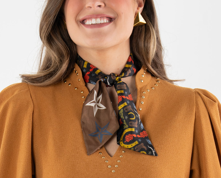 The Lone Star Scarfette is a versatile skinny silk twill scarf that captures the spirit of Texas in a modern way. One side highlights a collage of western icons—horseshoes, boots, snakes, stars, and bluebonnets—while the reverse showcases rows of bold Texas stars. Its double-sided design gives you multiple styling options, whether tied at the neck, wrapped on a bag, or worn as a hair accessory. Crafted in 100% silk, it’s a collectible piece that balances heritage with a chic edge.